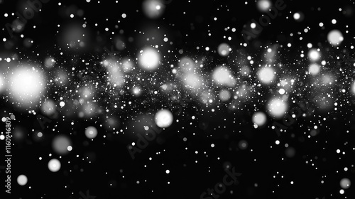 Fototapeta premium Blurred white lights bokeh on black background. Bokeh pattern overlay for holiday design card, invitation, greeting, website banner. Modern abstract design.