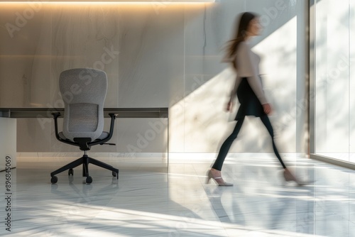 Fototapeta premium Blurred Woman Walking Past Modern Office Chair and Desk