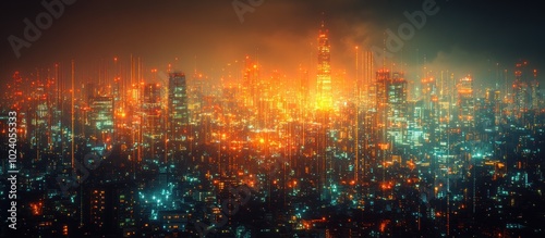 © Alienmarsh, Obraz premium Blurry aerial view of a city at night with glowing lights and skyscrapers.