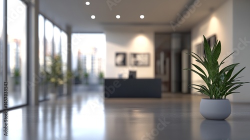© THUA, Obraz premium Blurry background of a sleek modern office bright panoramic windows soft ambient light minimalist and elegant interior.