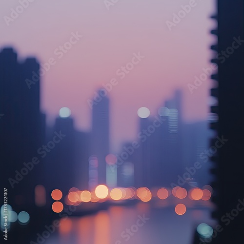 Obraz premium Blurry city skyline at dawn, bokeh lights on water