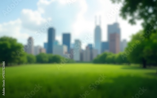 Fototapeta premium Blurry cityscape with lush greenery. High quality