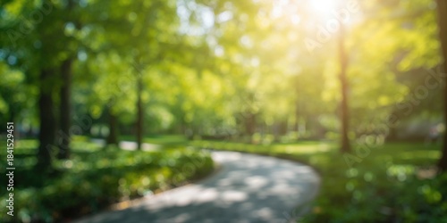 © The 2R Artificiality, Naklejka premium Blurry image of green natural trees in the background, suitable as a background for text and layout, Earth Day