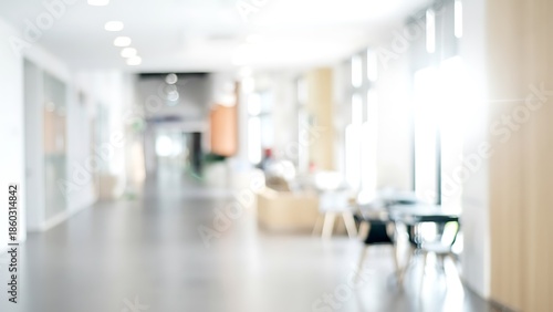 Fototapeta premium Blurry modern office lobby corridor with seating area and bright natural light