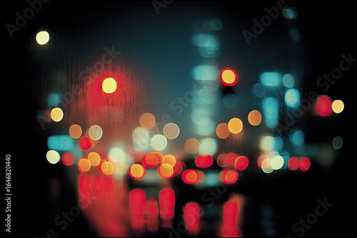 © Pixy, Obraz premium Blurry night city lights through rain-streaked glass