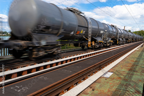 Naklejka premium Blurry photo of railroad tank cars in motion, on a metal bridge over the river.