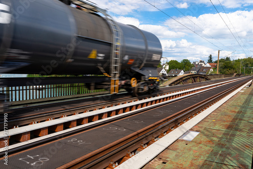 © Michal, Naklejka premium Blurry photo of railroad tank cars in motion, on a metal bridge over the river.