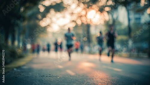 © Ukii, Fototapeta premium Blurry runners in a park at sunrise