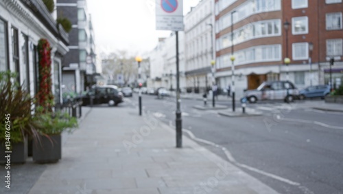 Fototapeta premium Blurry winter street scene in london with defocused cars and buildings, capturing a typical british urban atmosphere with a hint of autumn in the environment.