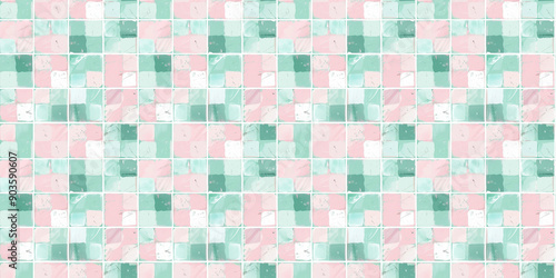 Fototapeta premium Blush pink and light teal tiles background, clean surface texture, white...