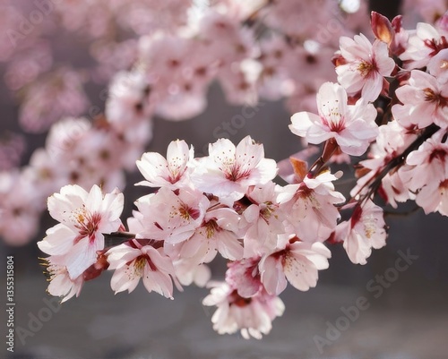 Fototapeta premium Blush-pink cherry blossoms in a silken blur, pale gold accents, abstract...