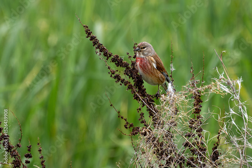 © Harald Schindler, Fototapeta premium Bluthänfling, auch Hänfling oder Flachsfink auf der suche nach Niestmaterial / Vogel