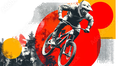 © Chinnasorn, Fototapeta premium BMX cyclist stunt midair dynamic geometric dotted texture helmet mountain forest backdrop action adrenaline graphic poster collage silhouette orange red yellow contrast bursting with, isolated
