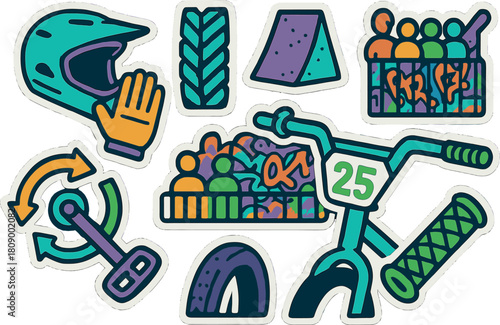 Fototapeta premium Bmx racing sticker set featuring bike, helmet, and gear in vibrant colors