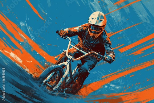 Fototapeta premium BMX rider illustration with a blue and orange background.