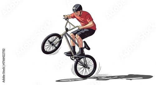 © Budi, Naklejka premium BMX Rider Performing Wheelie Stunt on Bicycle Against White Background.