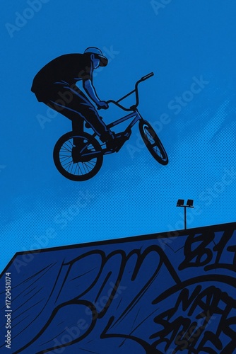 © JuanCarlos, Fototapeta premium BMX rider silhouette jumping high above a graffiti-covered ramp against a dark blue sky.