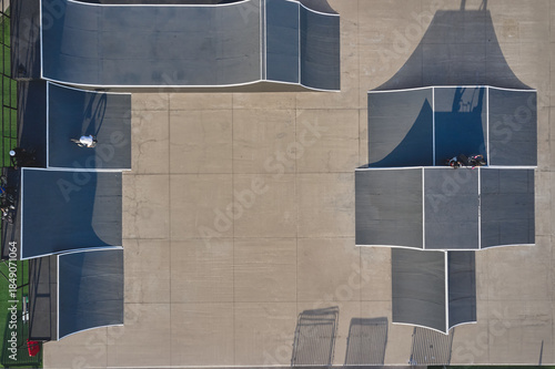 Fototapeta premium Bmx riders performing tricks in an urban skate park, creating long shadows