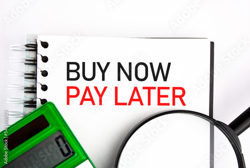© Binkontan, Naklejka premium BNPL Buy now pay later - text concept next to calculator. The concept of bargain purchases in installments, credit.