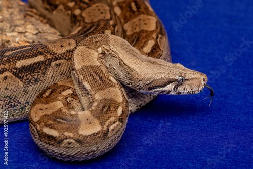 © Peter Togel, Obraz premium Boa Constrictor Snake on Blue Background - Exotic Wildlife