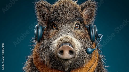 © Luxetify, Fototapeta premium Boar Wearing Headset Against Teal Background