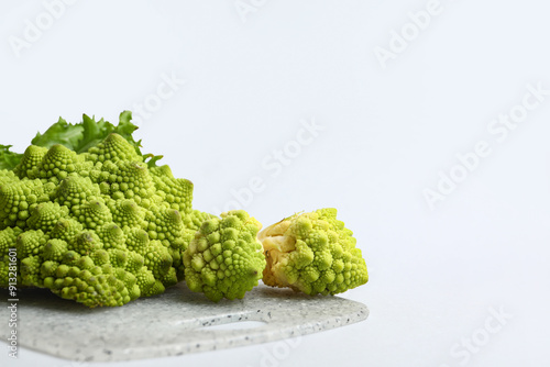 © Pixel-Shot, Fototapeta premium Board with fresh Romanesco broccoli on light background
