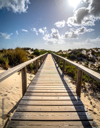 © Aditya, Obraz premium Boardwalk to the beach - A scenic path to the sea.