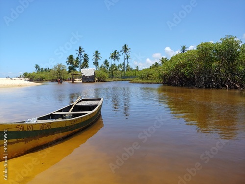 © wagner, Fototapeta premium boat and wooden house in river on the beach