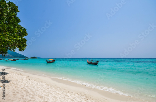 © magneticmcc, Naklejka premium Boat at the coast with blue sea and sky in Lipe Thailand - landscape