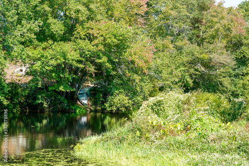 Obraz premium Boat docked in lush woods.