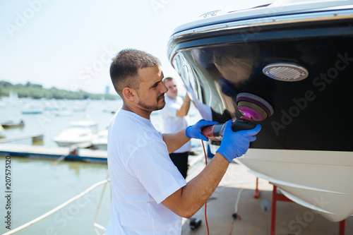 Fototapeta premium Boat maintenance - Man with orbital polisher polishing boat in marina....
