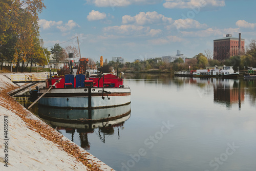 © lenaivanova2311, Fototapeta premium boat moored on a river city port