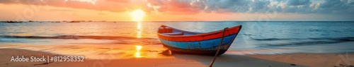 © BrandwayArt, Fototapeta premium Boat Moored on Beach at Sunset