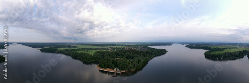 © константин константи, Fototapeta premium boat mooring on the river at sunrise filmed from a drone