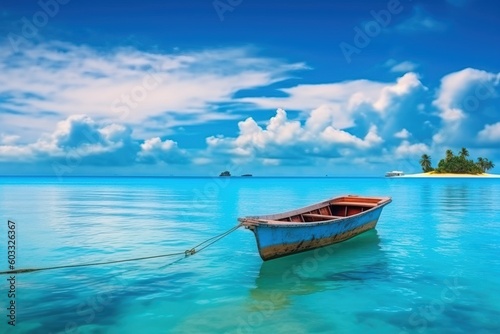 © Nico, Naklejka premium boat on a great blue sea with blue sky and clouds Generative AI
