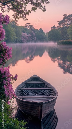 © Natalia, Fototapeta premium Boat on calm lake with pink flowers and trees reflecting in water. Mist is visible on the lake. AI.
