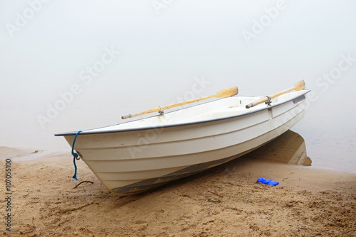 Fototapeta premium Boat on shore. Early morning fog