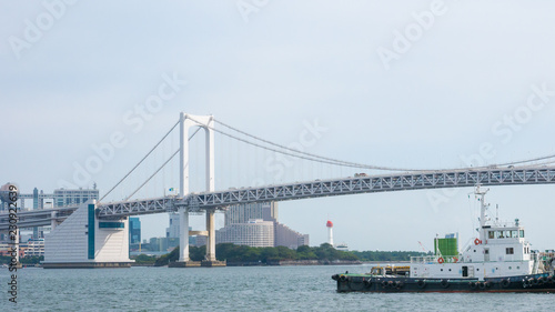 © christian, Naklejka premium Boat on Sumida river with background on the beautiful Tokyo Rainbow Bridge.
