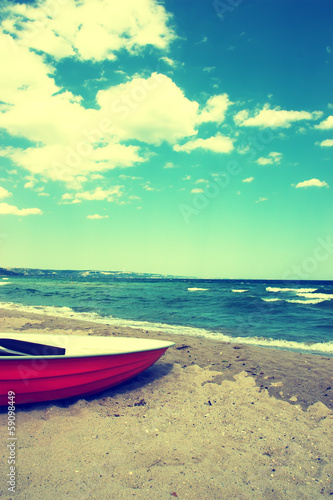 Naklejka premium Boat on the beach.Vintage Beach Background