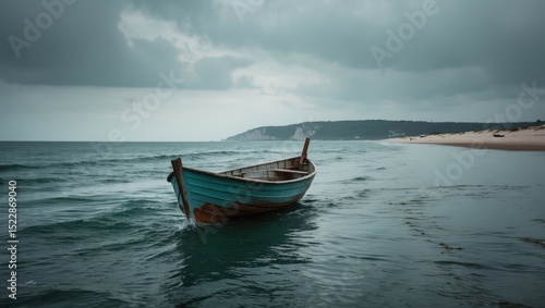 © Lasvu, Fototapeta premium Boat on the sea with the beach in the background, featuring empty space for text.