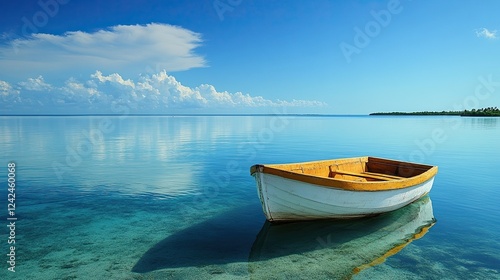 © Seerat, Naklejka premium Boat on the Water with Clear Blue Sky, Ideal for Summer Adventures oe Perfect for Boating Photography, capturing the peaceful nature of boating in a tropical setting