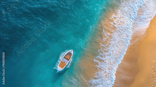 © AriyaniAI, Fototapeta premium Boat on Turquoise Waters with Foamy Shore
