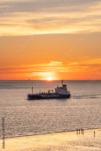 Fototapeta premium Boat passing by the beach in Vlissingen Holland in sunset