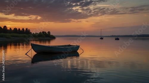 © Free, Naklejka premium boat sits calmly in a lake at sunset.