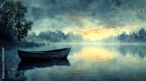 Fototapeta premium Boat sits on misty lake at dawn.