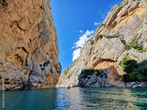 Fototapeta premium Boat trip on turquoise water of mountain canyon, Verdon Gorge in french Alps,...