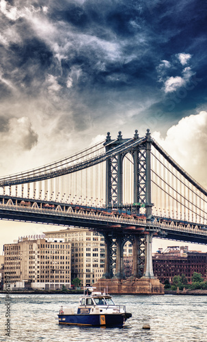 © jovannig, Fototapeta premium Boat under Manhattan Bridge