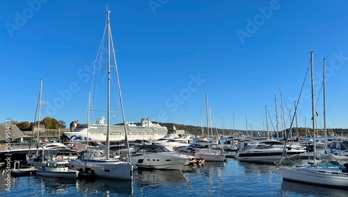 Naklejka premium Boats and cruise ship docked in the harbor of Oslo in Norway