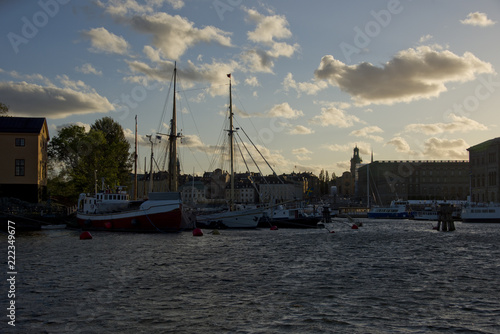 © Hans Baath, Fototapeta premium Boats and landmarks at Stockholm waterfront at sunset