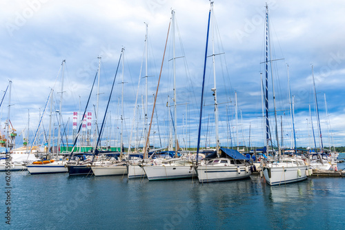 © Yaroslav, Naklejka premium boats and yachts on pier in marine city port with masts and bulidings and blue sky on background , water cityscape of urban port